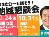 2025年10月20日 / 最終更新日 : 2025年10月20日 たけまさ公一 イベント情報 10月地域懇談会のご案内 ~国政の最新報告と質疑応答~ 10月の地域懇談会は国政の最新報告と質疑応答を予定しております。各区の県議会議員市議会議員も参加予定です。すべて参加費無料でどなたでもご参加いただけ、途中参加や途中退席も自由です。お誘い合わ […]