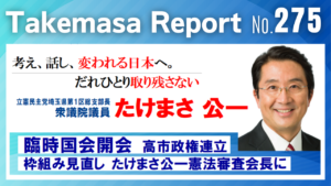 政治に議論を取り戻します。そのためにみんなで考えます。そして日本を変えます。「だれひとり取り残さない!」「考え、話し、変われる日本に!」 たけまさ公一の政策 県議2期。衆議院議員7期中に外務財務副相を務める。さいたま市浦和区大東在住。妻と一男一女の4人家族。 たけまさ公一の実績 イベント情報 10月地域懇談会のご案内 第240回「たけまさ公一と語る会」 過去の語る会のテーマ たけまさNEWS たけまさレポート275号を発行しました2025年10月21日 東大宮地域懇談会を開催2025年10月11日 待ったなしです2025年10月10日 たけまさ公一と共に たけまさ公一後援会 たけまさ公一後援会の主な活動をご紹介いたします。登録は無料で会費なども頂いておりません。 詳細はこちら ボランティア たけまさと共に、政治を変えるアクションを起こしませんか。皆さんのできるやり方で少しづつ。 詳細はこちら たけまさレポート たけまさレポートは早朝の駅頭活動や地域懇談会などでお配りしております。 詳細はこちら たけまさ公一SNS お気軽にフォローしてください。 facebook page X(旧Twitter) LINE YouTube