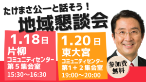 政治に議論を取り戻します。そのためにみんなで考えます。そして日本を変えます。「だれひとり取り残さない!」「考え、話し、変われる日本に!」 たけまさ公一の政策 県議2期。衆議院議員7期中に外務財務副相を務める。さいたま市浦和区大東在住。妻と一男一女の4人家族。 たけまさ公一の実績 イベント情報 地域懇談会のご案内① 地域懇談会のご案内② 第243回「たけまさ公一と語る会」 たけまさNEWS 「物価高騰対策先送り」解散2026年1月14日 さいたま市消防出初式2026年1月11日 若鳶会はしごのり2026年1月8日 たけまさ公一と共に たけまさ公一後援会 たけまさ公一後援会の主な活動をご紹介いたします。登録は無料で会費なども頂いておりません。 詳細はこちら ボランティア たけまさと共に、政治を変えるアクションを起こしませんか。皆さんのできるやり方で少しづつ。 詳細はこちら たけまさレポート たけまさレポートは早朝の駅頭活動や地域懇談会などでお配りしております。 詳細はこちら たけまさ公一SNS お気軽にフォローしてください。 facebook page X(旧Twitter) LINE YouTube